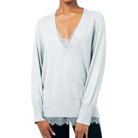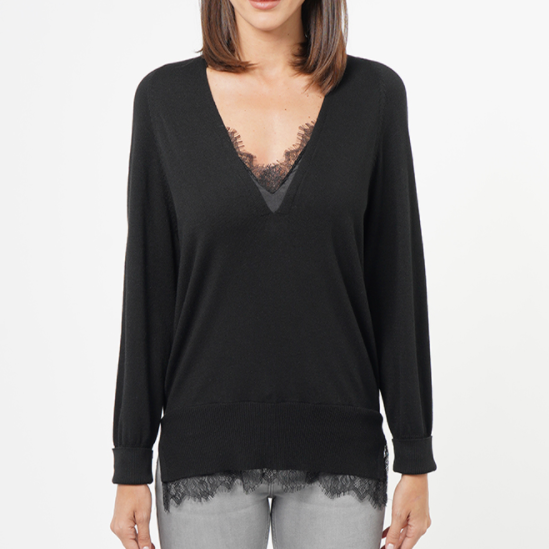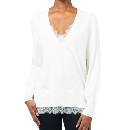 V neck sweater with lace details on the neck and hem line.