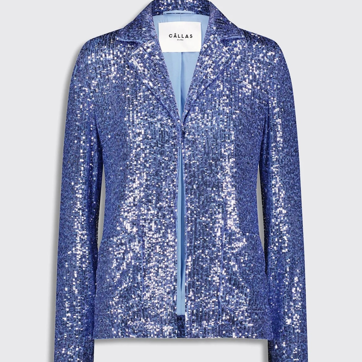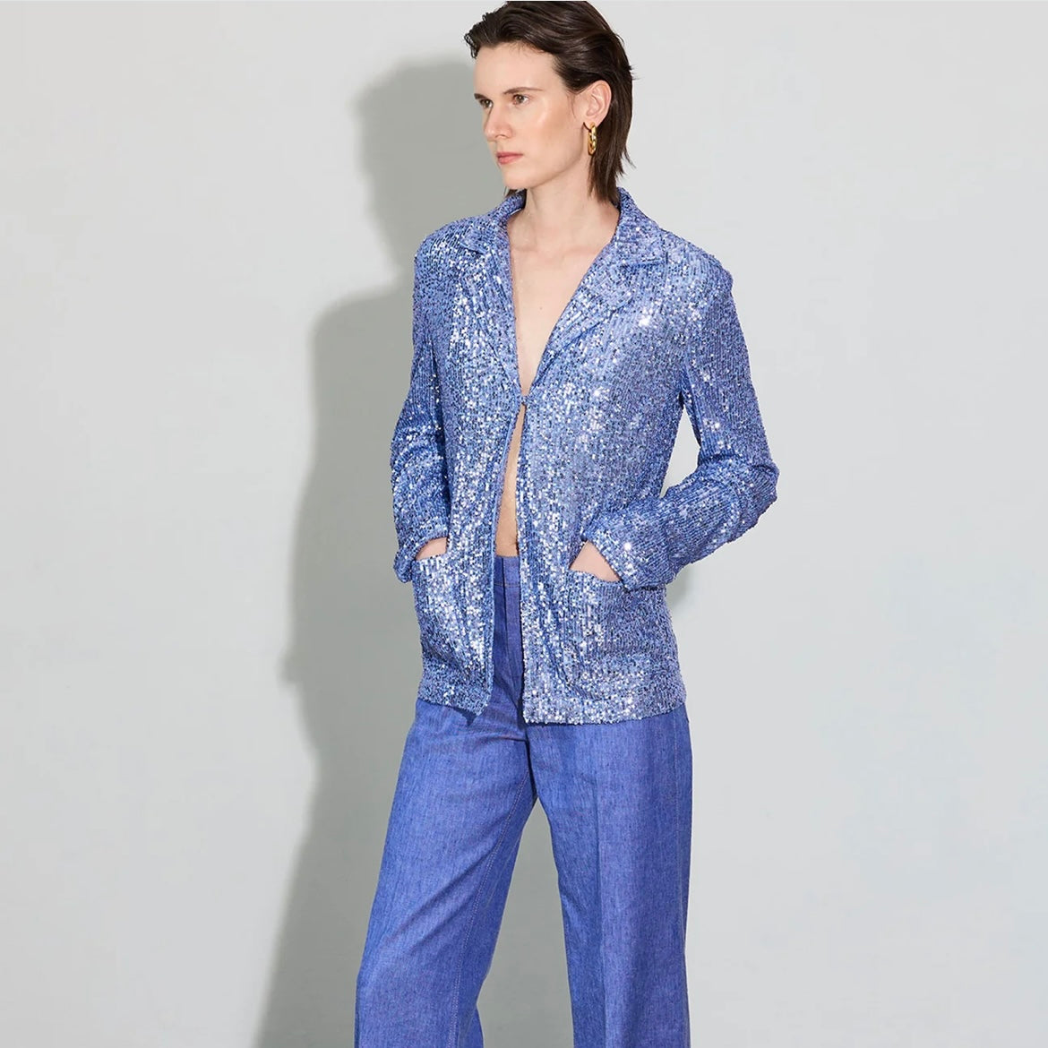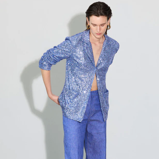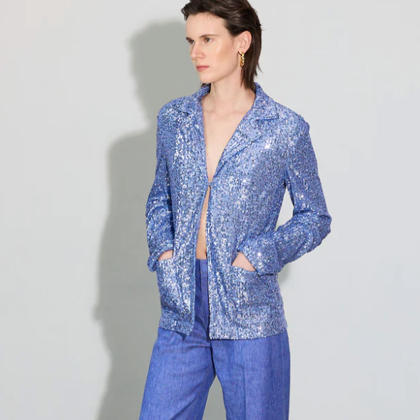 The PJ is named for the relaxed pajama attitude of this all over sequin embroidered shirt jacket. The open collar, long sleeves and relaxed silhouette creates a balance of ease and soft tailoring. A single hook closes the front of the jacket. Extra deep hem of the sleeves make it easy to roll up the sleeves to suit your style. The front features two patch pockets. Fully lined. Made in Italy.